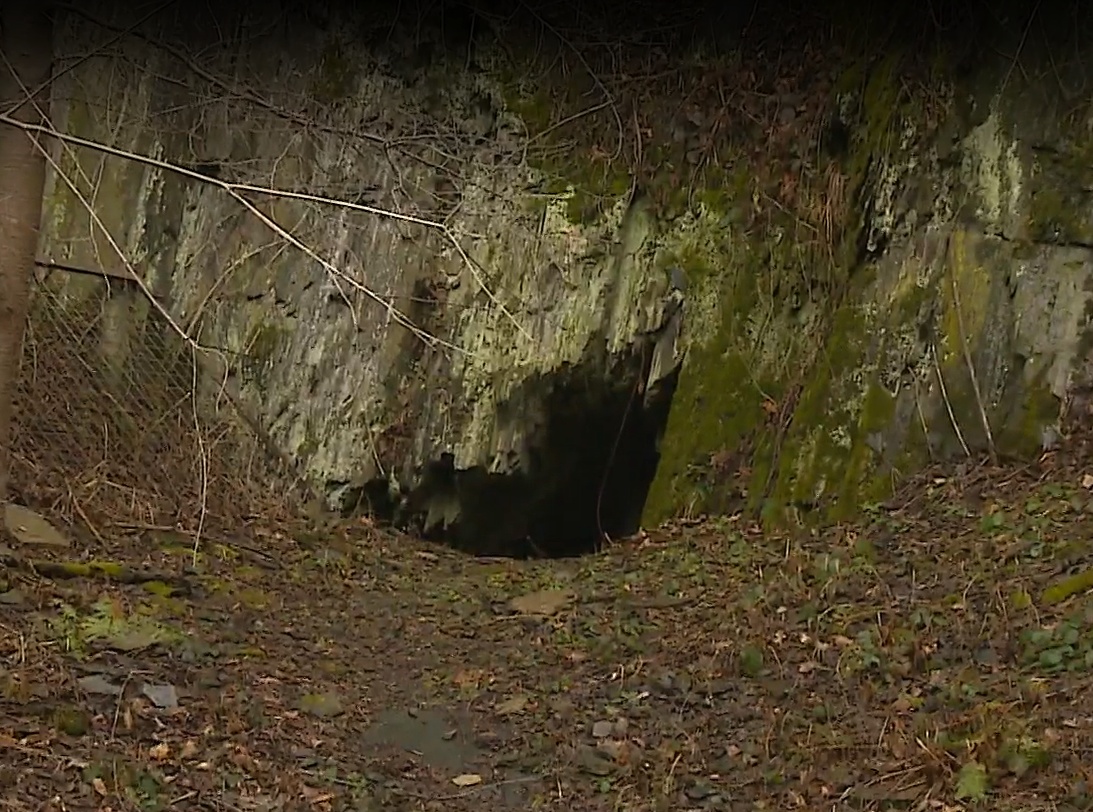 ⚒ Pohľad do ústia bridlicovej štôlne spoza zábradlia v miniexpozícii bridlice. Foto: Jozef Kráľ, 15.4.2024