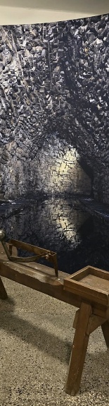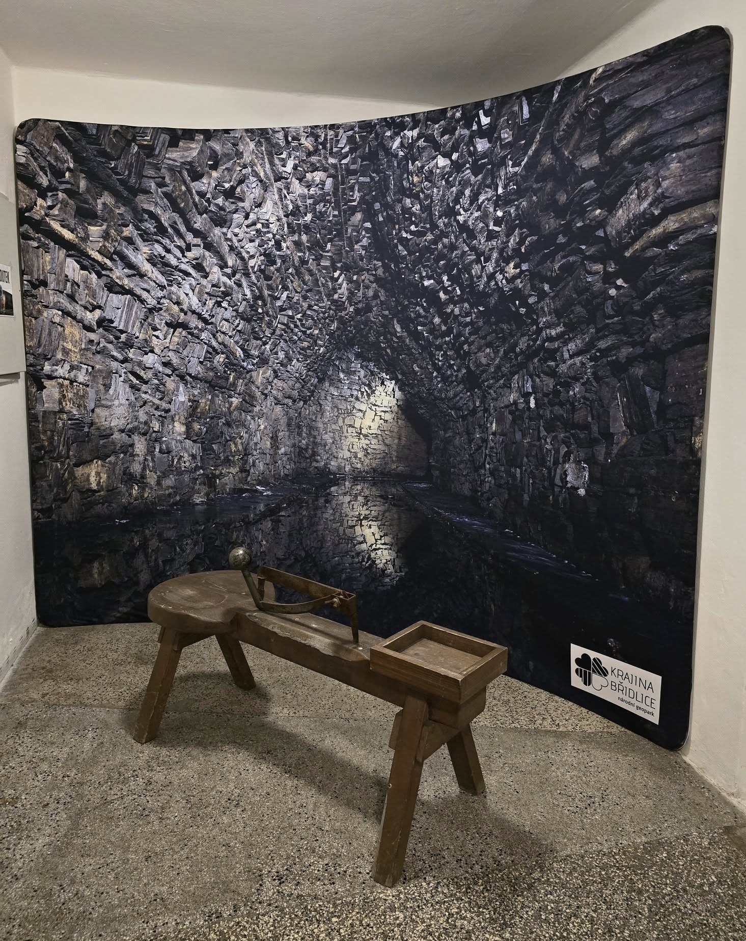 ⚒ Pohľad do ústia bridlicovej štôlne spoza zábradlia v miniexpozícii bridlice. Foto: Jozef Kráľ, 15.4.2024