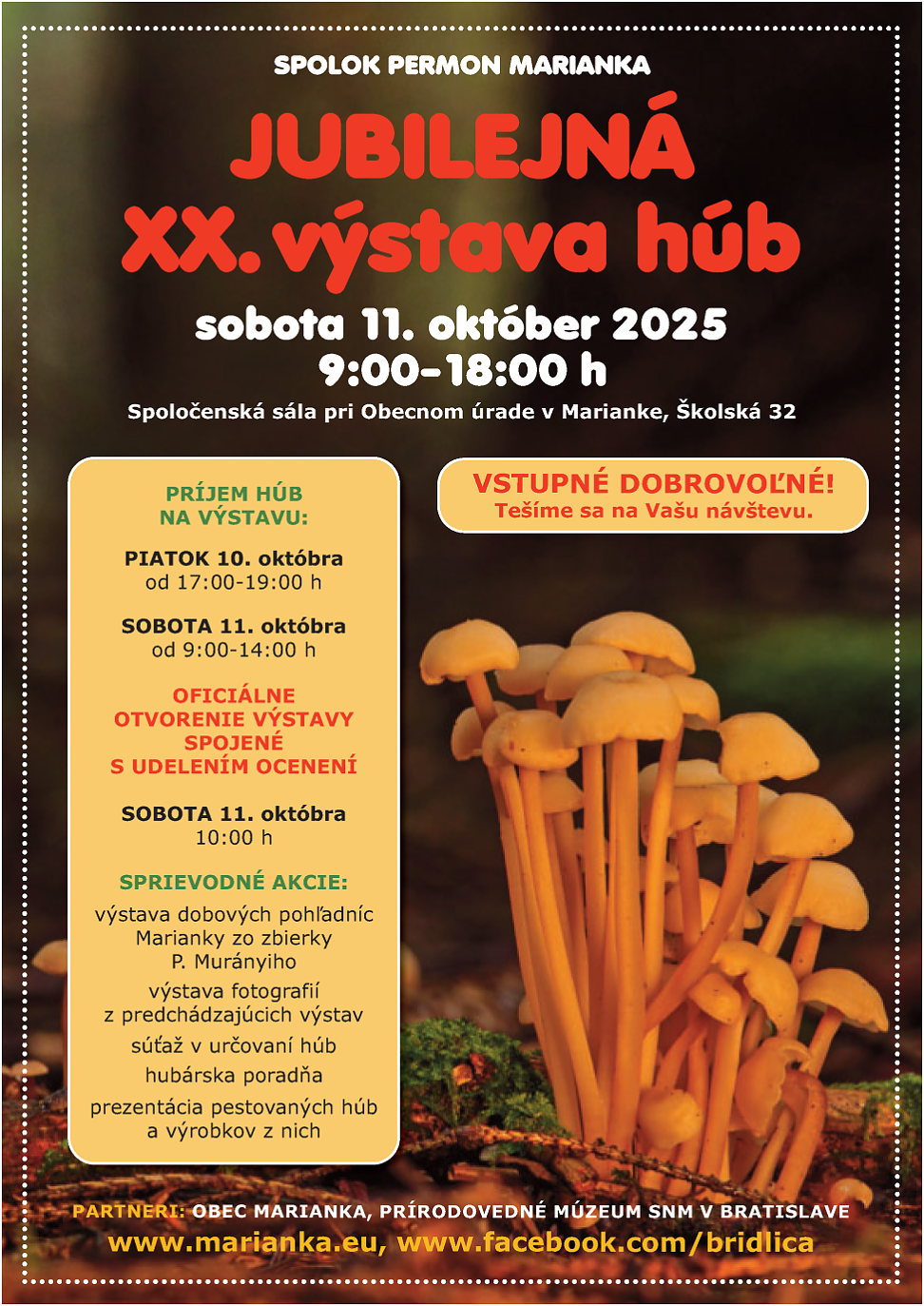 VI. výstava húb sa bude konať 4. septembra 2010 od 9.oo-18.oo hod. v Spoločenskom dome v Marianke. Sprievodnou akciou výstavy bude exkluzívna výstava minerálov a hornín banských regiónov Slovenska.